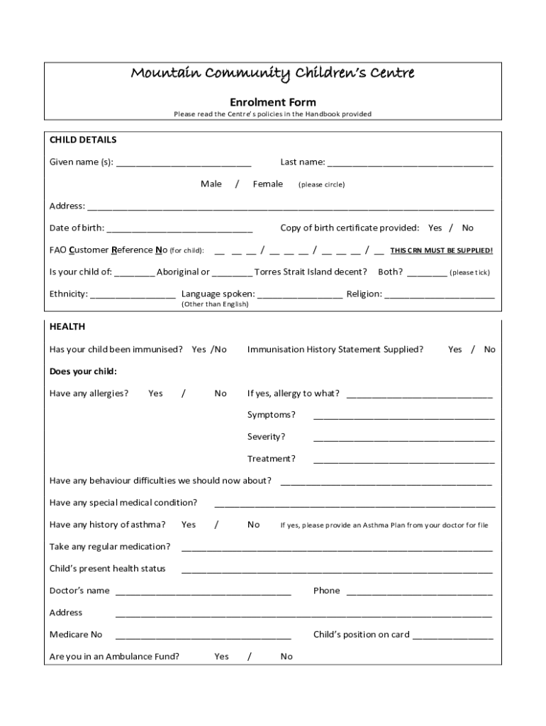 Mountain Community Children's Center Enrollment Form Please read the Centers policies in the Handbook providedCHILD DETAILS Given name (s): Male/Last name: Female(please circle)Address: Date of birth: