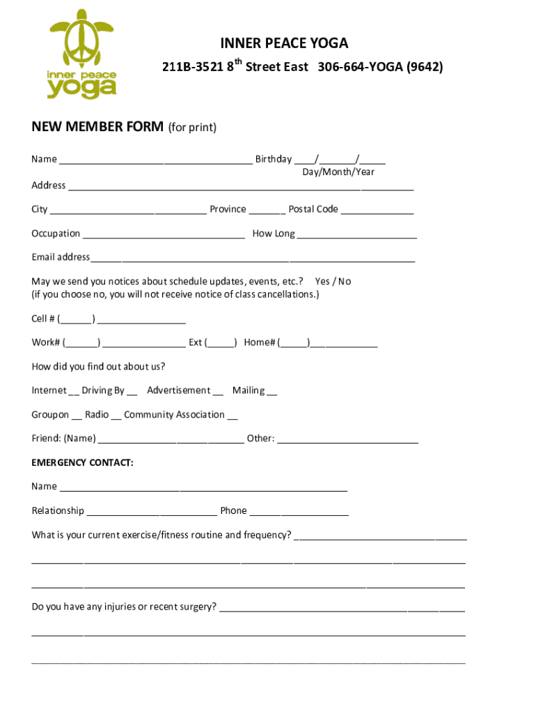 INNER PEACE YOGA 3521 8th Street East 306664YOGA YOGA (9642)NEW MEMBER FORM (for print) Name Birthday / / Day/Month/Year Address City Province Postal Code Occupation How Long Email address May we