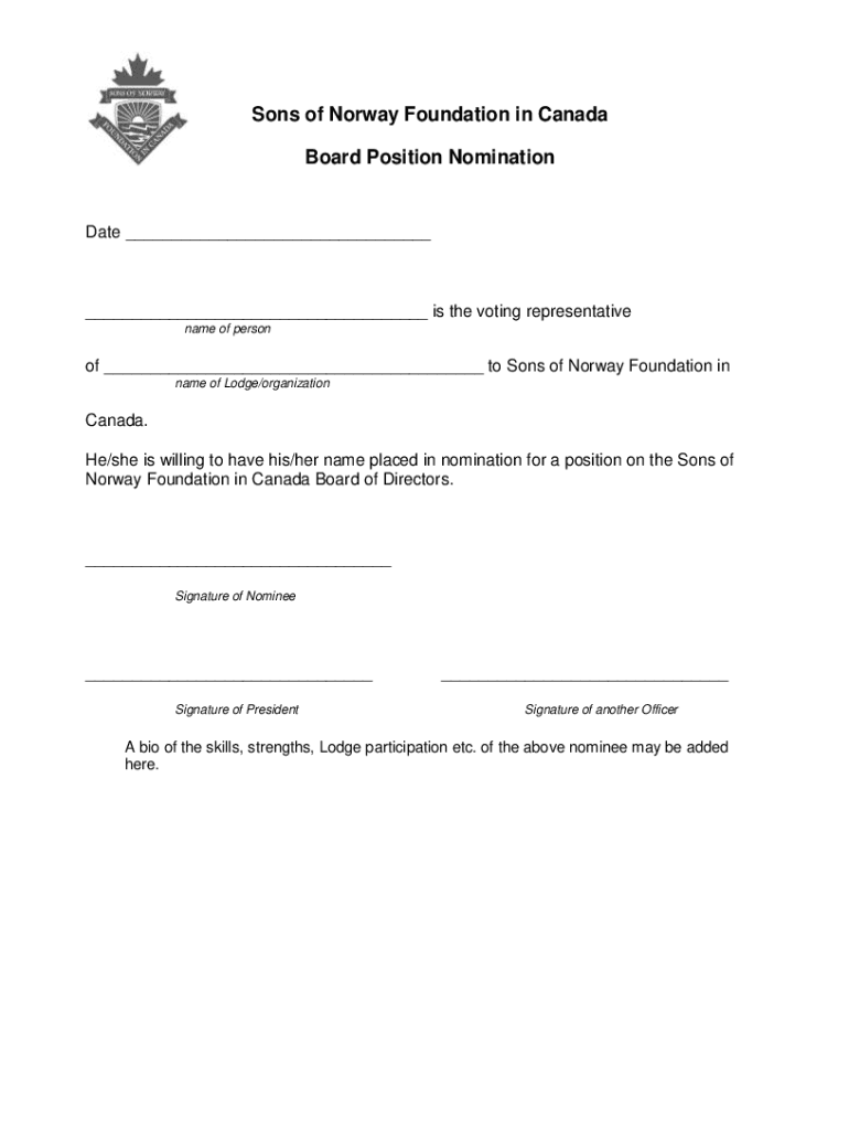 Sons of Norway Foundation in Canada Board Position NominationDate is the voting representative name of person of to Sons of Norway Foundation in name of Lodge/organization Canada. He/she is willing
