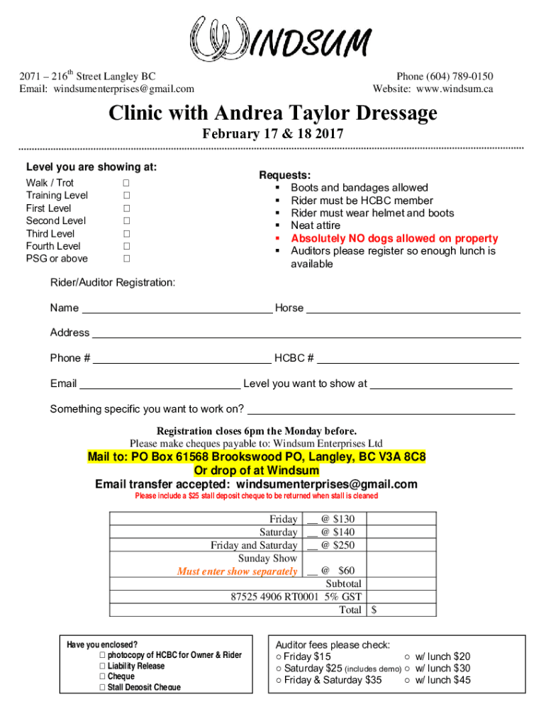2071 216th Street Langley BC Email: windsumenterprises Gmail. Compose (604) 7890150 Website: www.windsum.caClinic with Andrea Taylor Dressage February 17 & 18 2017 Level you are showing at: Walk /
