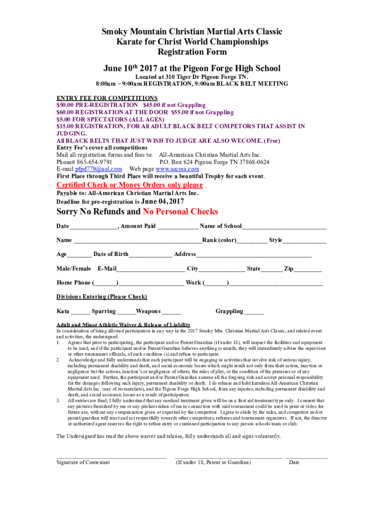 Smoky Mountain Christian Martial Arts Classic Karate for Christ World Championships Registration Form June 10th 2017 at the Pigeon Forge High School Located at 310 Tiger Dr Pigeon Forge TN. 8:00am