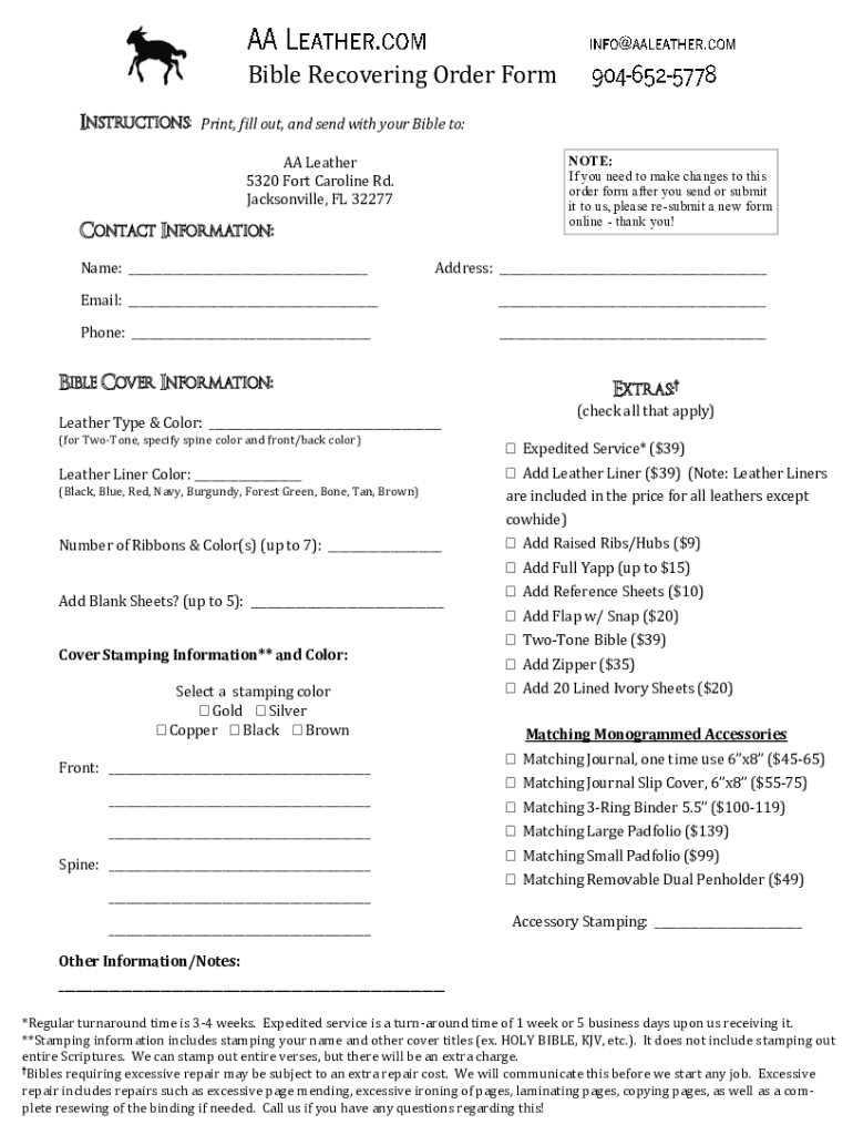Bible Recovering Order Form Instructions:Print, fill out, and send with your Bible to: NOTE: If you need to make changes to this order form after you send or submit it to us, please resubmit a new