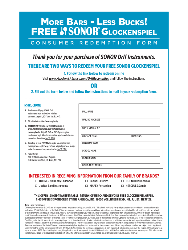 More Bars Fewer Bucks! FREE Glockenspiel CO N S U M E RR E D E M P T I O NF O RM Thank you for your purchase of HONOR Off Instruments. THERE ARE TWO WAYS TO REDEEM YOUR FREE HONOR GLOCKENSPIEL 1.