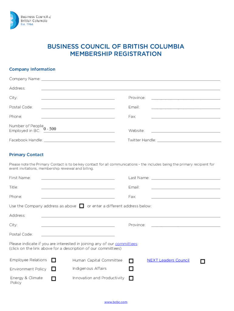 BUSINESS COUNCIL OF BRITISH COLUMBIA MEMBERSHIP REGISTRATION Company Information Company Name: Address: City: Province: British Newfoundland Quebec Ontario Manitoba Saskatchewan Alberta New Nova Prince