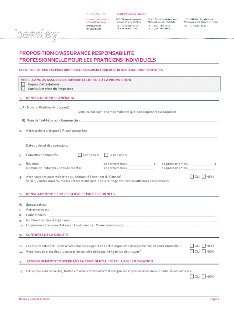Obtenir le gratuit PROPOSITION DASSURANCE RESPONSABILIT PROFESSIONNELLE POUR LES PRATICIENS INDIV...