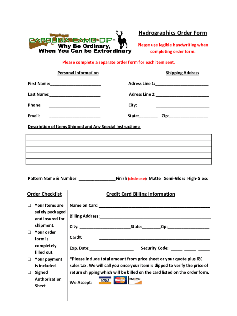 Hydro graphics Order Form Please use legible handwriting when completing order form. Please complete a separate order form for each item sent. Shipping AddressPersonal Information First Name: Address