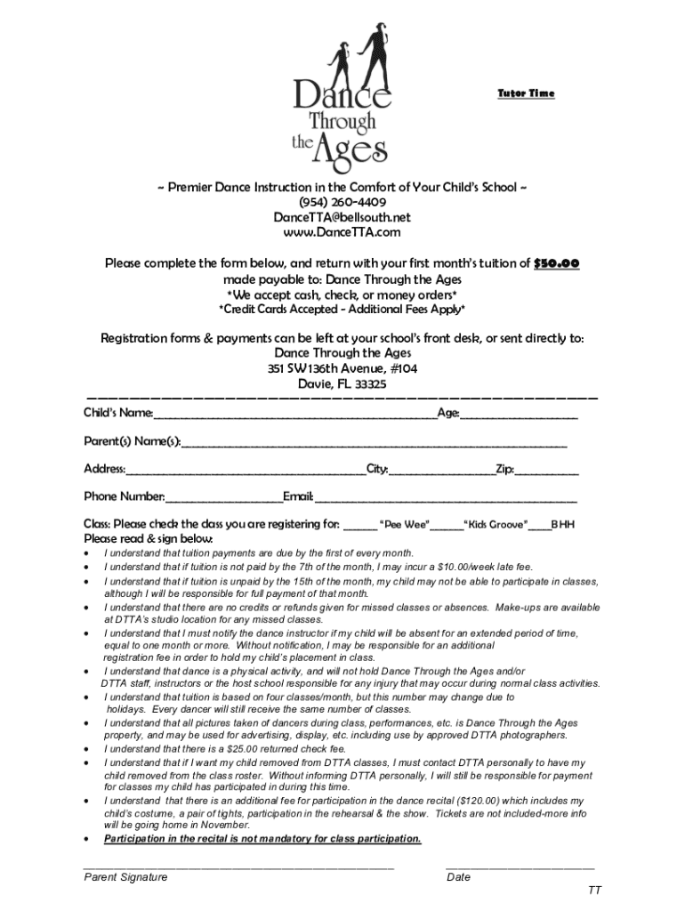 Tutor Time Premier Dance Instruction in the Comfort of Your Child's School (954) 2604409 Dance TTA bell south.net www.DanceTTA.com Please complete the form below, and return with your first months