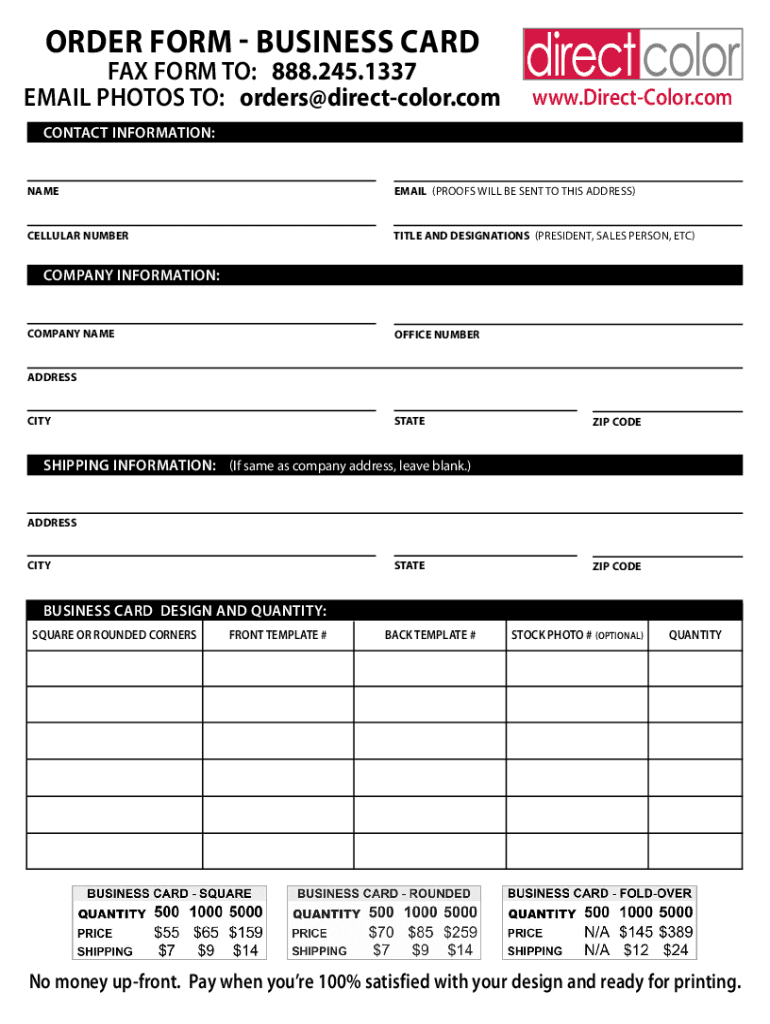 ORDER FORM BUSINESS CARD FAX FORM TO: 888.245.1337 EMAIL PHOTOS TO: orders direct color.come. Director.noncontact INFORMATION:NAMEEMAIL (PROOFS WILL BE SENT TO THIS ADDRESS)CELLULAR NUMBERTITLE AND