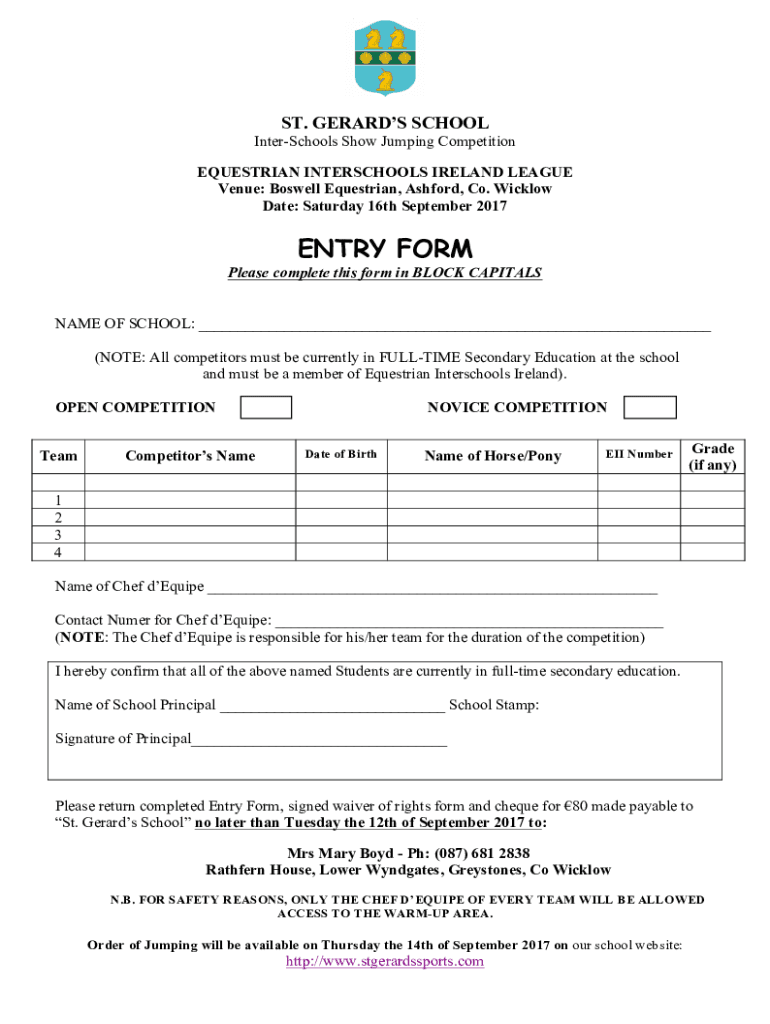 ST. GERARD SCHOOL Interschool Show Jumping Competition EQUESTRIAN INTERSCHOOL IRELAND LEAGUE Venue: Boswell Equestrian, Ashford, Co. Wick low Date: Saturday 16th September 2017ENTRY FORM Please complete