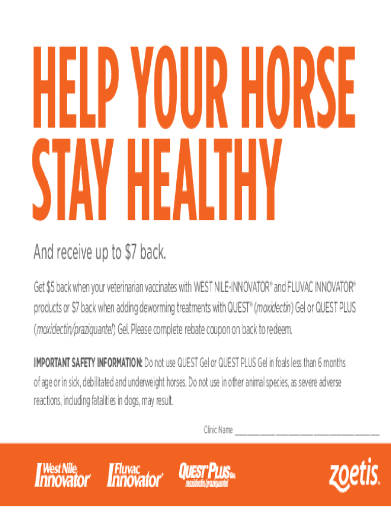 HELP YOUR HORSE STAY HEALTHY And receive up to $7 back. Get $5 back when your veterinarian vaccinates with WEST NILEINNOVATOR and FLU VAC INNOVATOR products or $7 back when adding deforming treatments
