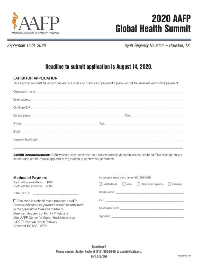 2020 AAF Global Health Summit September 1719, 2020Hyatt Regency Houston, Deadline to submit application is August 14, 2020. EXHIBITOR GUIDELINES The 2020 AAF Global Health Summit is projected to attract