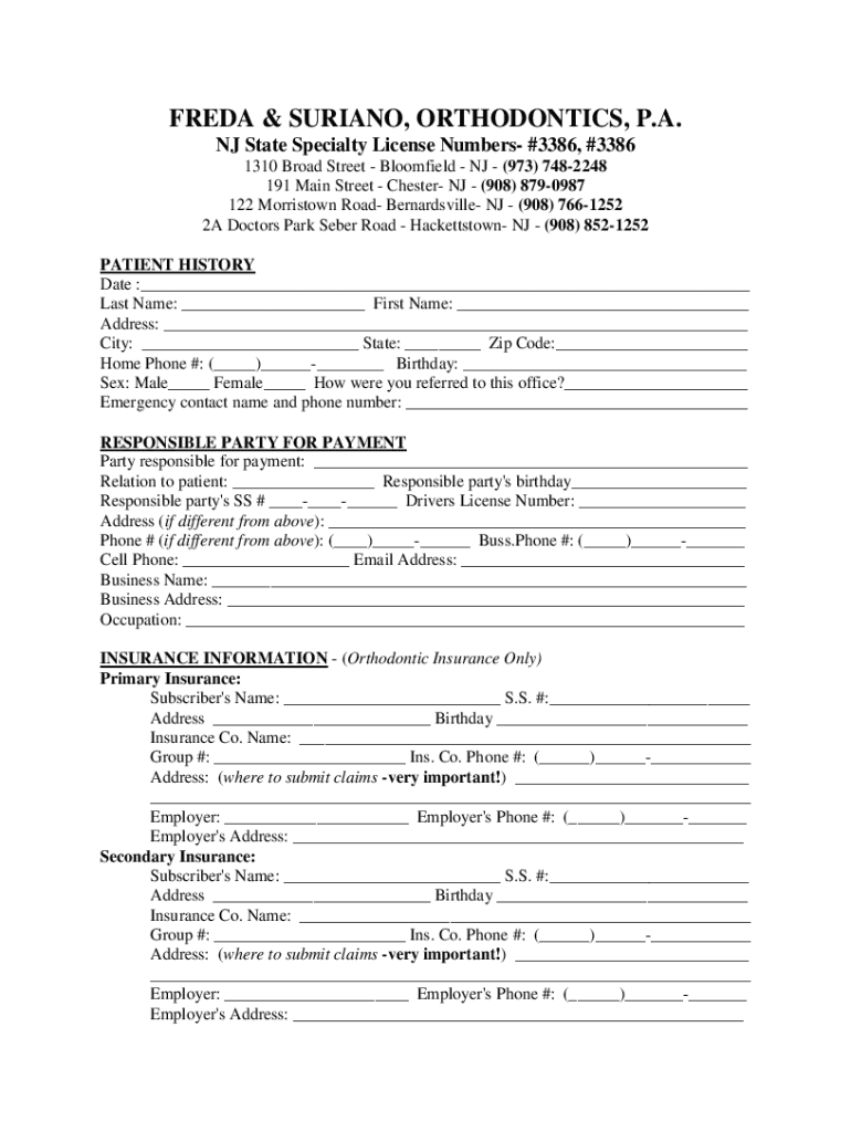 FREDA & SORIANO, ORTHODONTICS, P.A. NJ State Specialty License Numbers #3386, #3386 1310 Broad Street Bloomfield NJ (973) 7482248 191 Main Street Chester NJ (908) 8790987 122 Morristown Road Edwardsville