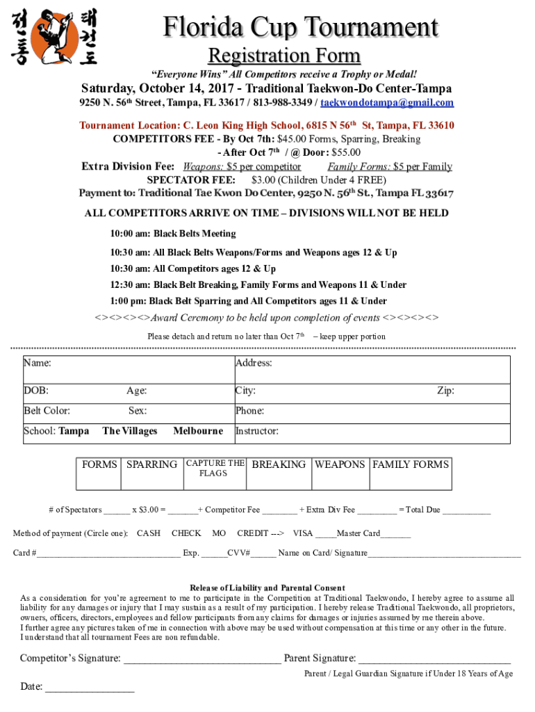 Florida Cup Tournament Registration Form Everyone Wins All Competitors receive a Trophy or Medal! Saturday, October 14, 2017, Traditional TaekwonDo Center Tampa 9250 N. 56th Street, Tampa, FL 33617