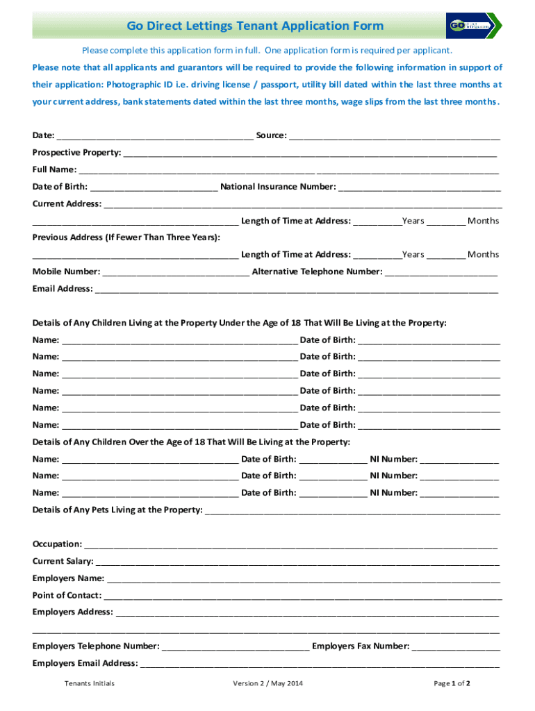 Go Direct Lettings Tenant Application Form Please complete this application form in full. One application form is required per applicant. Please note that all applicants and guarantors will be required