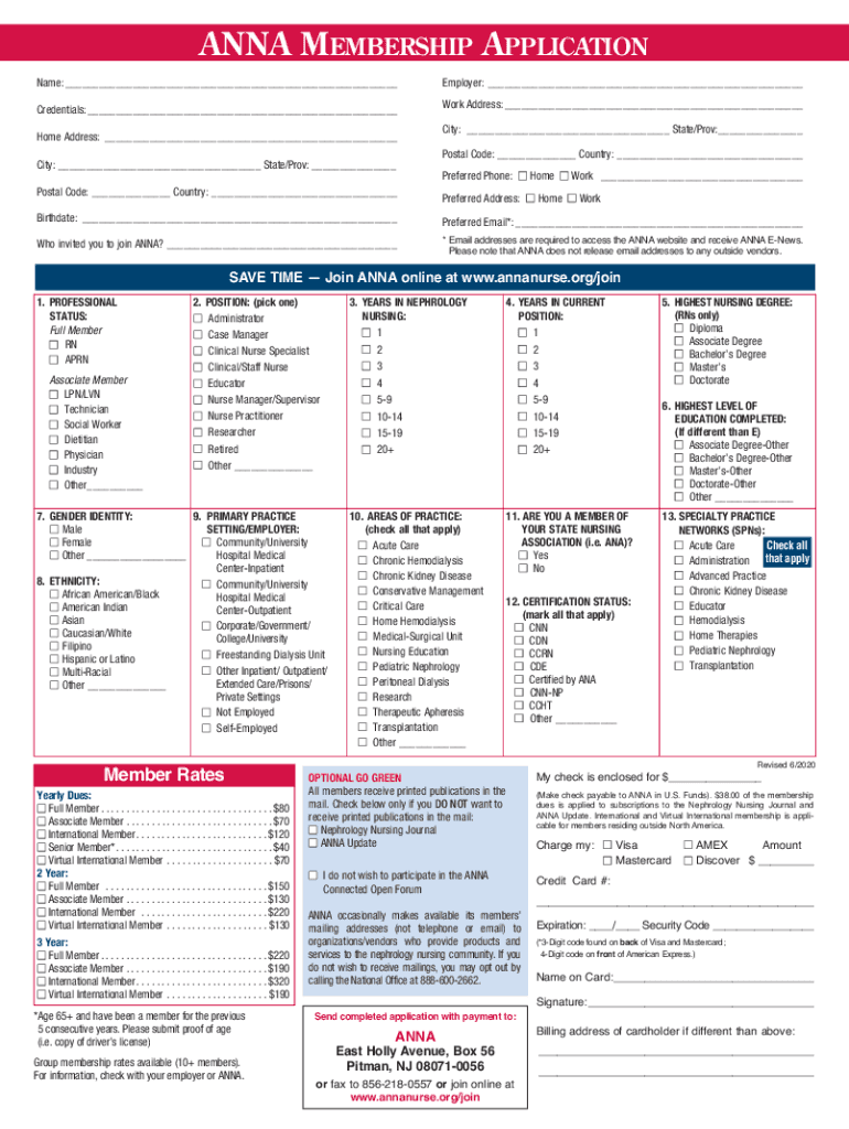 ANNA MEMBERSHIP APPLICATION Name: Employer: Credentials: Work Address: Home Address: City: State/Prov: Postal Code: Country: City: State/Prov: Preferred Phone: Homework Postal Code: Country: Preferred