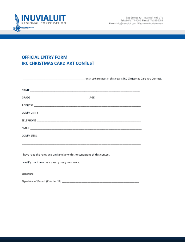 Bag Service #21, Inuit NT X0E 0T0 Tel: (867) 7777000 Fax: (877) 2892389 Email: info inuvialuit.com Web: www.inuvialuit.comOFFICIAL ENTRY FORM IRC CHRISTMAS CARD ART CONTEST I wish to take part in