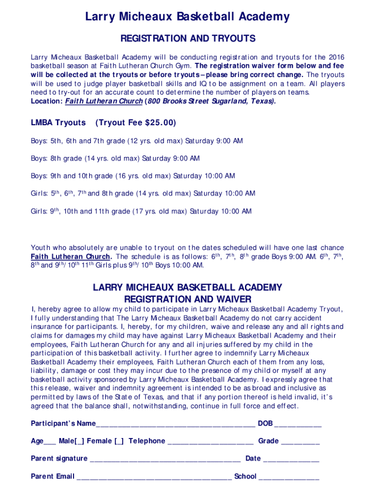 Larry Micheal Basketball Academy REGISTRATION AND TRYOUTS Larry Micheal Basketball Academy will be conducting registration and tryouts for the 2016 basketball season at Faith Lutheran Church Gym.