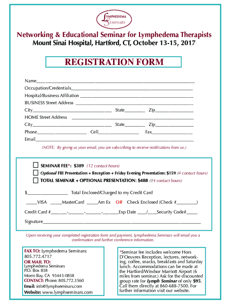 LSYMPHEDEMAEMINARSNetworking & Educational Seminar for Lymphedema Therapists Mount Sinai Hospital, Hartford, CT, October 1315, 2017REGISTRATION FORM Name Occupation/Credentials Hospital/Business Affiliation