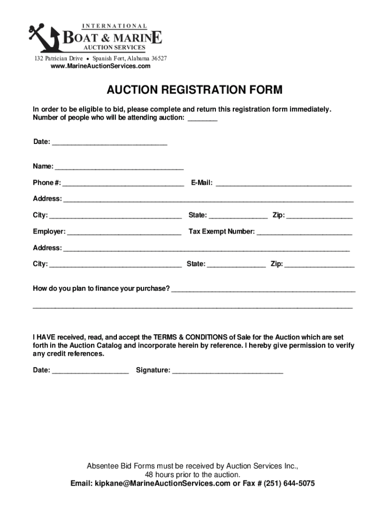 132 Patrician Drive Spanish Fort, Alabama 36527 www.MarineAuctionServices.comAUCTION REGISTRATION FORM In order to be eligible to bid, please complete and return this registration form immediately.