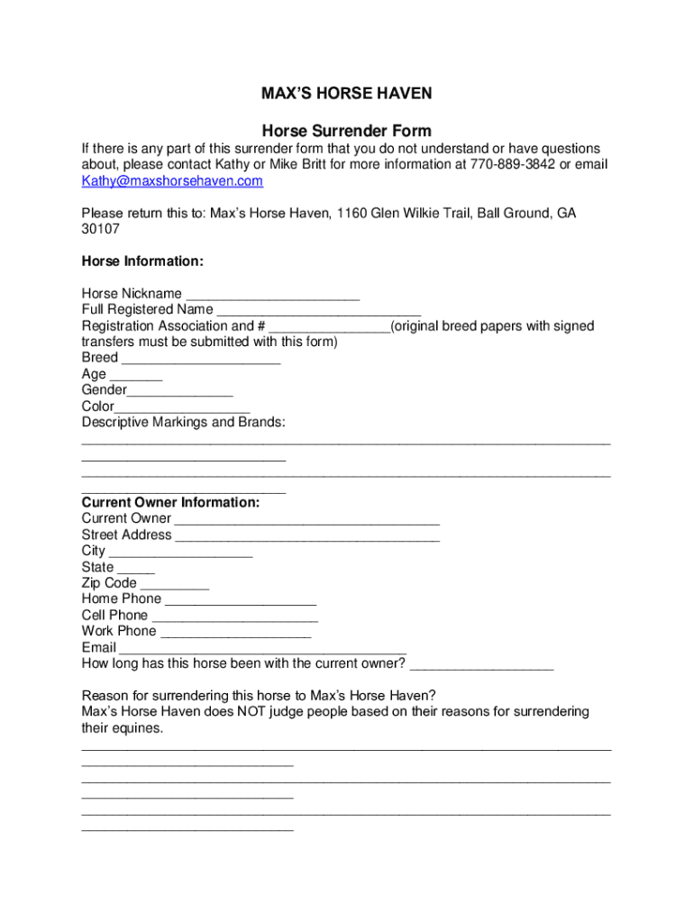 MASS HORSE HAVEN Horse Surrender Form If there is any part of this surrender form that you do not understand or have questions about, please contact Kathy or Mike Britt for more information at 7708893842