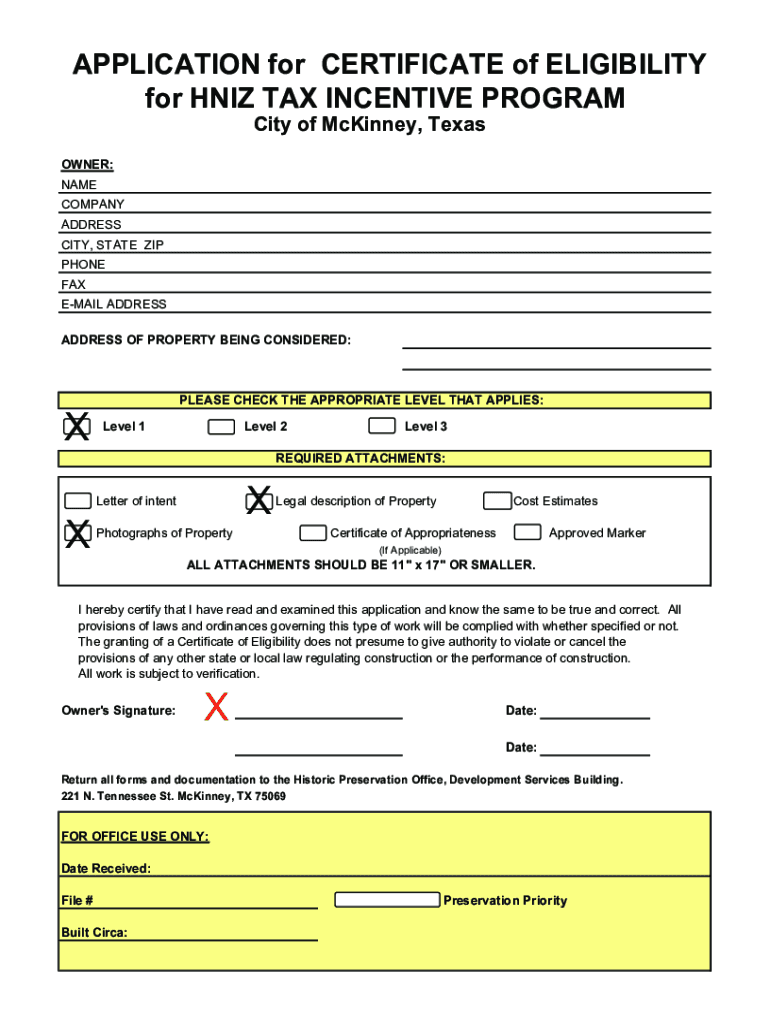APPLICATION for CERTIFICATE of ELIGIBILITY for HIS TAX INCENTIVE PROGRAM City of McKinney, Reasoner: NAME COMPANY ADDRESS CITY, STATE ZIP PHONE FAX EMAIL ADDRESS OF PROPERTY BEING CONSIDERED:XX PLEASE