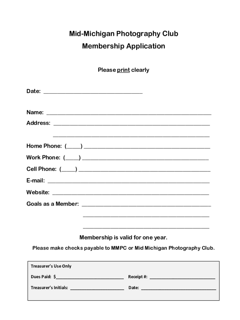 MidMichigan Photography Club Membership Application Please print clearlyDate: Name: Address: Home Phone: () Work Phone: () Cell Phone: () Email: Website: Goals as a Member: Membership is valid for