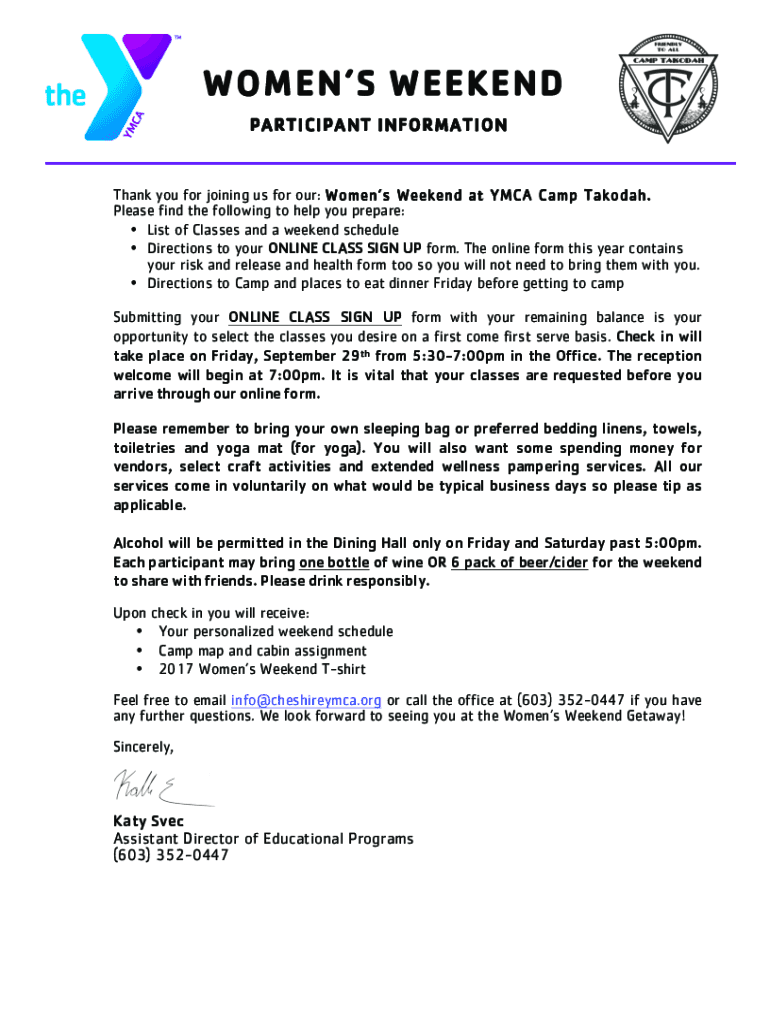 WOMEN WEEKEND PARTICIPANT INFORMATIONThank you for joining us for our: Women's Weekend at YMCA Camp Takeda. Please find the following to help you prepare: List of Classes and a weekend schedule Directions