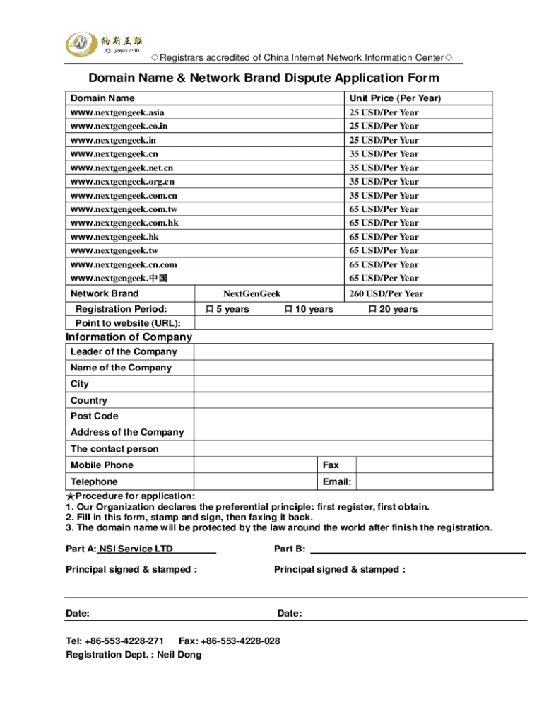 Registrars accredited of China Internet Network Information CenterDomain Name & Network Brand Dispute Application Form Domain Amount Price (Per Year)www.nextgengeek.asia25 USD/Per Year.nextgengeek.co.in25
