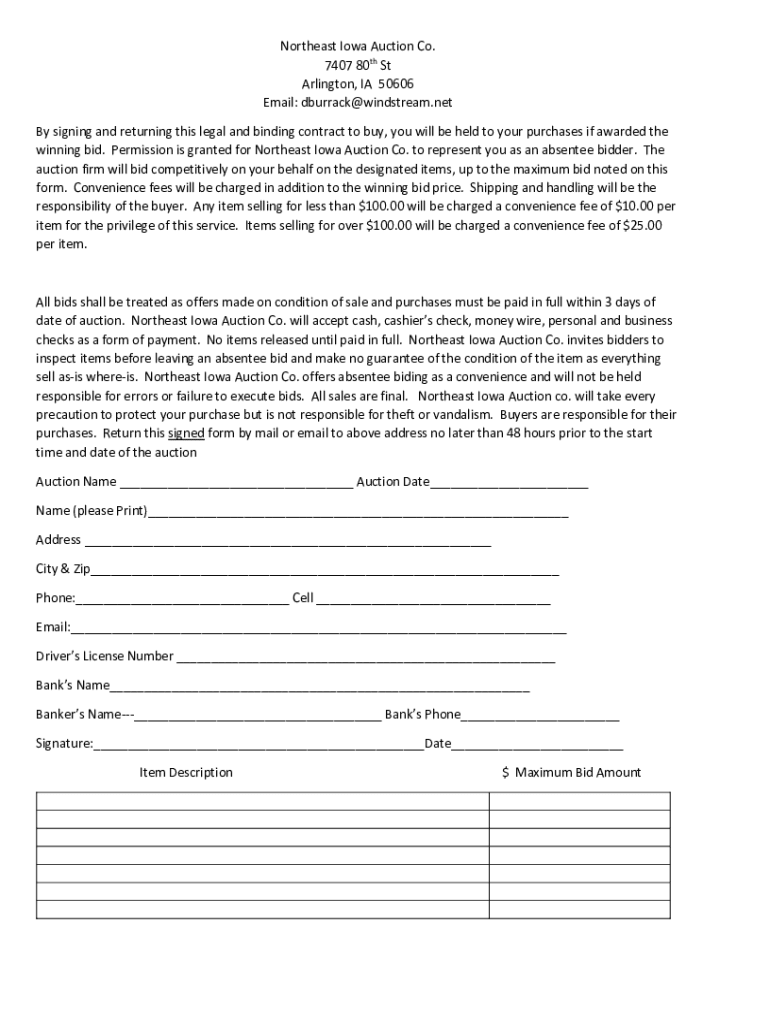 Get the free Northeast Iowa Auction Co. 7407 80th St Arlington, IA 50606 Email ...