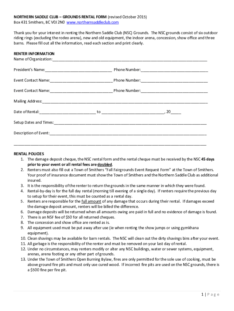 NORTHERN SADDLE CLUB GROUNDS RENTAL FORM (revised October 2015) Box 431 Smothers, BC V0J 2N0 www.northernsaddleclub.com Thank you for your interest in renting the Northern Saddle Club (NSC) Grounds.