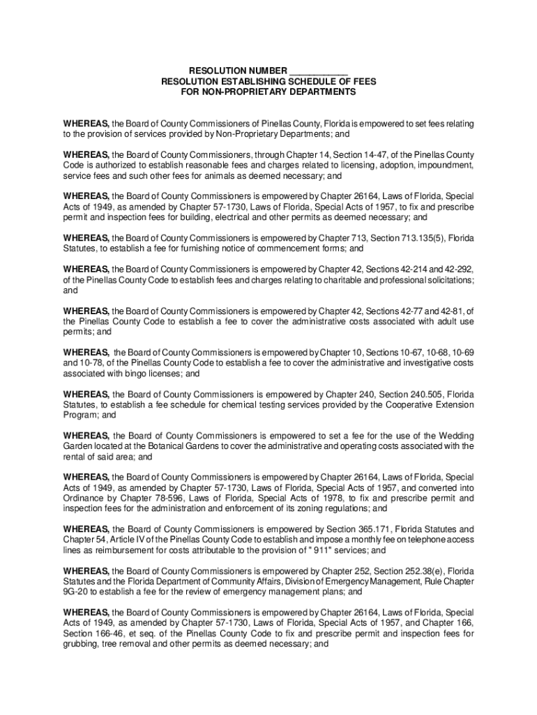 RESOLUTION NUMBER RESOLUTION ESTABLISHING SCHEDULE OF FEES FOR PROPRIETARY DEPARTMENTSWHEREAS, the Board of County Commissioners of Pinellas County, Florida is empowered to set fees relating to the