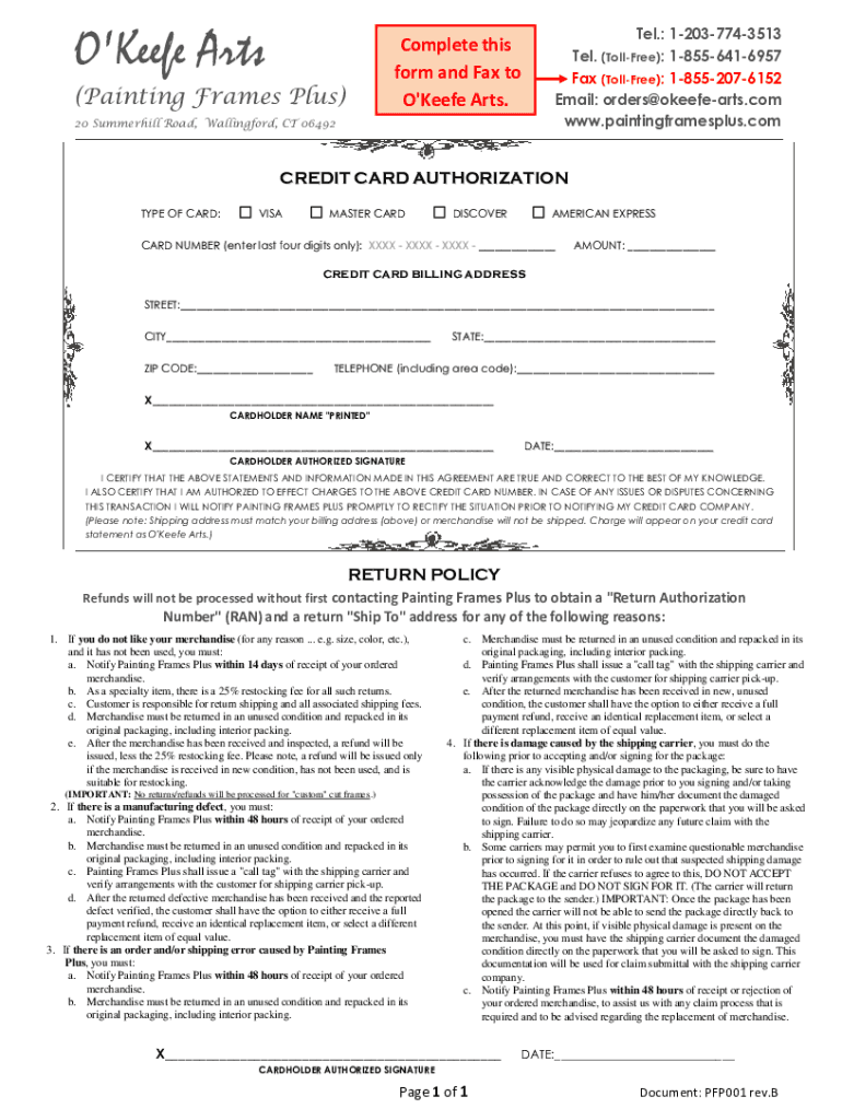 O 'Keeffe Artistes.: 12037743513 Tel. (Toll-free): 18556416957 Fax (Toll-free): 18552076152 Email: orders okeefearts.com www.paintingframesplus.comComplete this form and Fax to O 'Keeffe Arts.(Painting