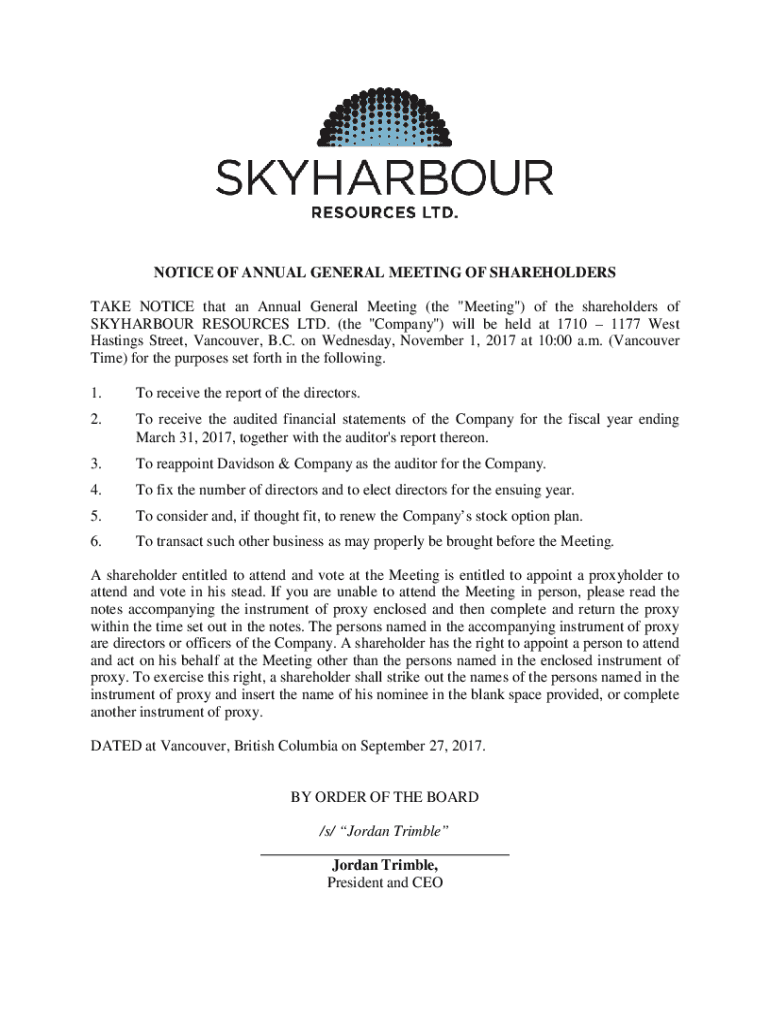 NOTICE OF ANNUAL GENERAL MEETING OF SHAREHOLDERS TAKE NOTICE that an Annual General Meeting (the “Meeting “) of the shareholders of SKYHARBOUR RESOURCES LTD. (the “Company “) will be held