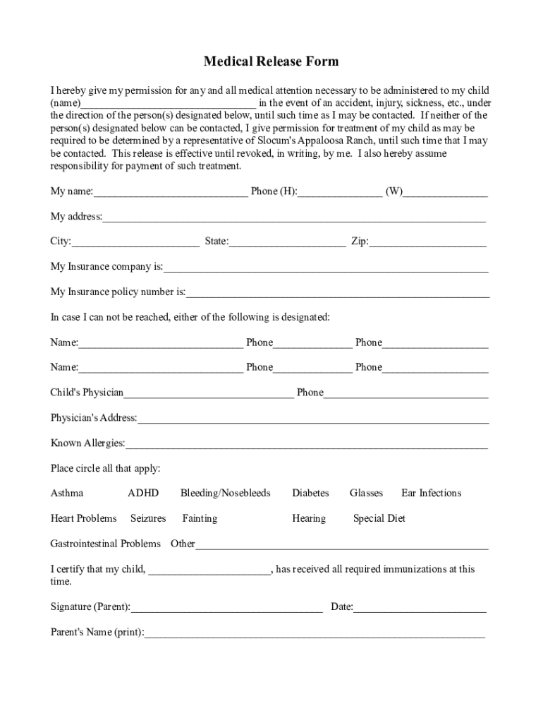 Medical Release Form I hereby give my permission for any and all medical attention necessary to be administered to my child (name) in the event of an accident, injury, sickness, etc., under the direction