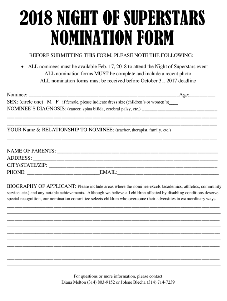 2018 NIGHT OF SUPERSTARS NOMINATION FORM BEFORE SUBMITTING THIS FORM, PLEASE NOTE THE FOLLOWING: ALL nominees must be available Feb. 17, 2018 to attend the Night of Superstars event ALL nomination