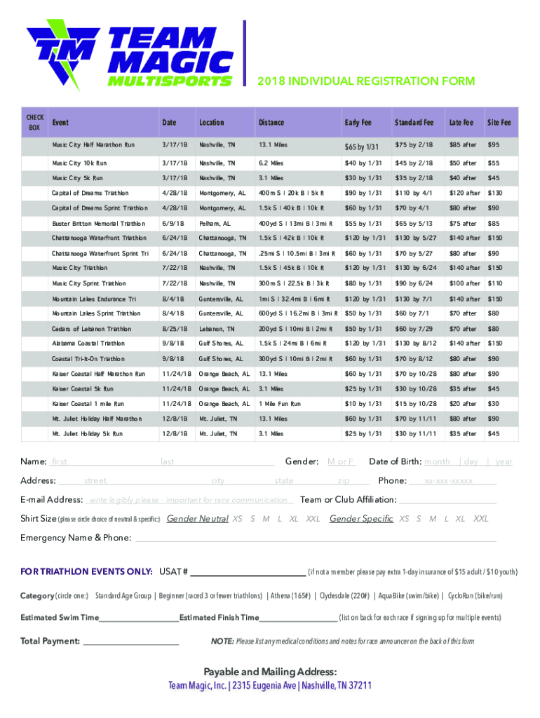2018 INDIVIDUAL REGISTRATION FORM CHECK BOXEventDateLocationDistanceEarly Standard Fee Late Fee Site Fe eMusic City Half Marathon Run3/17/18Nashville, TN13.1 Miles$65 by 1/$3175 by 2/$1885 after$95Music