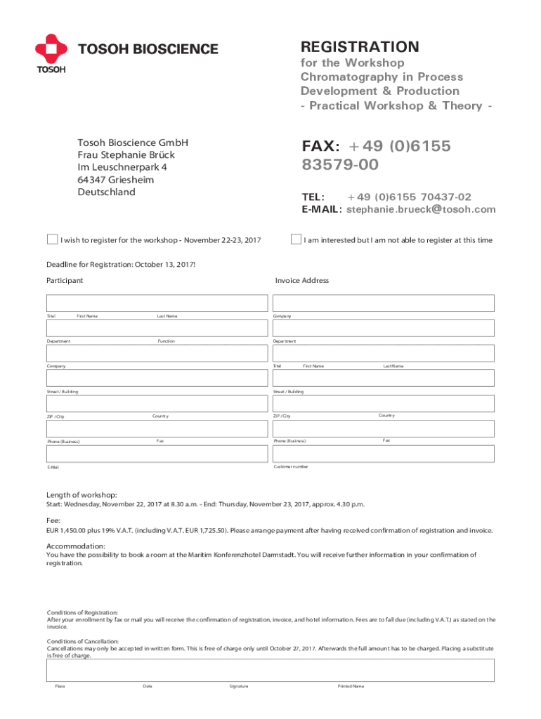 Registration for the Workshop Chromatography in Process Development & Production Practical Workshop & Theory FAX: +49 (0)6155 8357900Tosoh Bioscience GmbH Frau Stephanie Back I'm Leuschnerpark 4 64347
