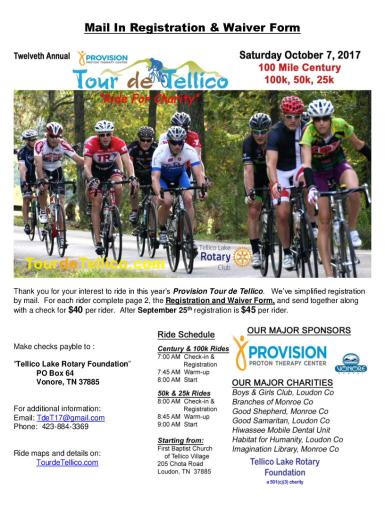 Mail In Registration & Waiver Firsthand you for your interest to ride in this year's Provision Tour de Tellico. We've simplified registration by mail. For each rider complete page 2, the Registration