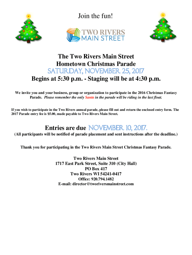 Join the fun! The Two Rivers Main Street Hometown Christmas Parade Saturday, November 25, 2017, Begins at 5:30 p.m. Staging will be at 4:30 p.m. We invite you and your business, group or organization