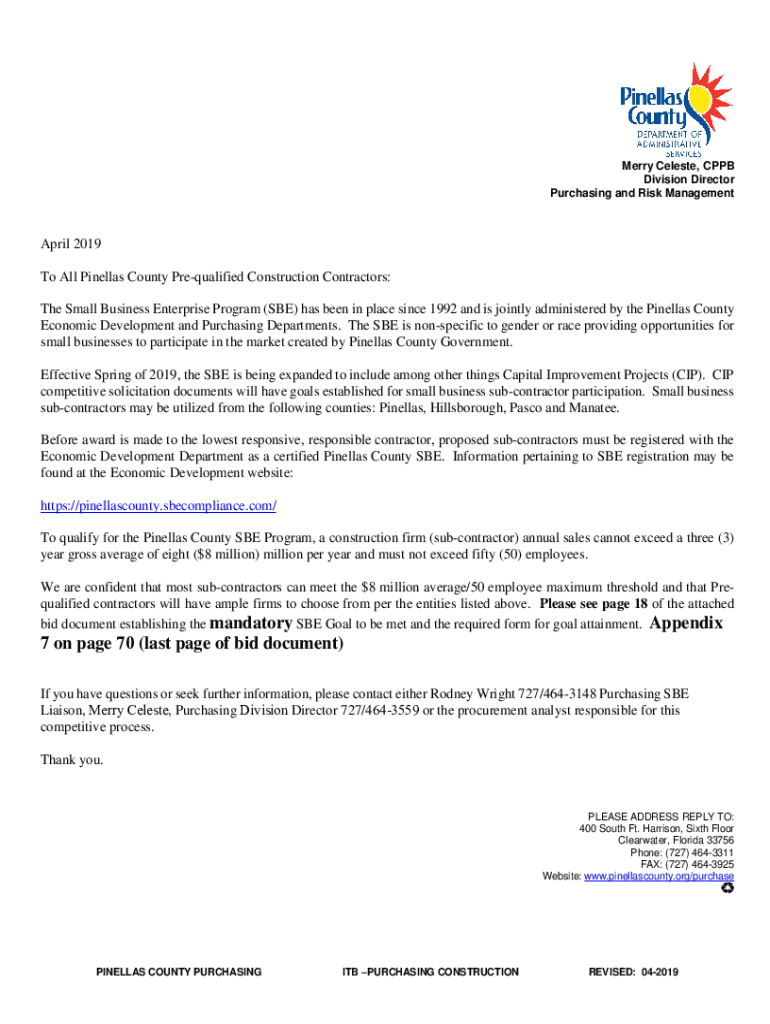 Get the free Sincerely, Merry Celeste, CPPB Director of Purchasing ... - files pinellascounty
