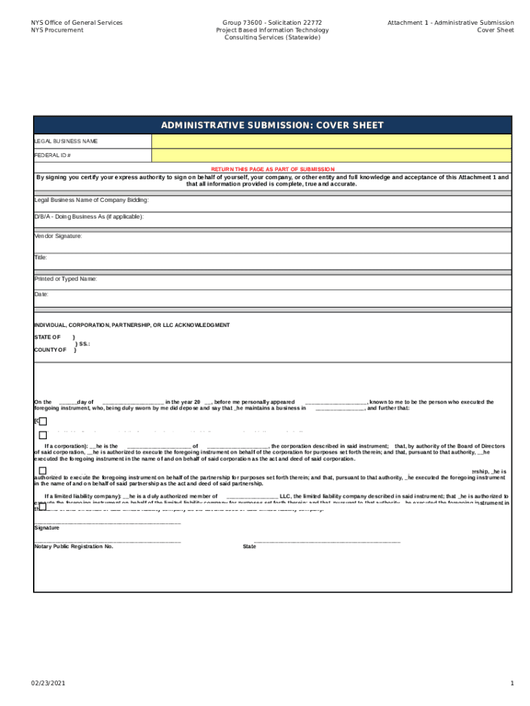 NYS Office of General Services NYS ProcurementGroup 73600 Solicitation 22772 Project Based Information Technology Consulting Services (Statewide)Attachment 1 Administrative Submission Cover SheetADMINISTRATIVE