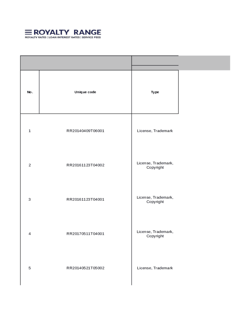 No. Unique codeType1RR20140409T06001License, Trademark2RR20161123T04002License, Trademark,