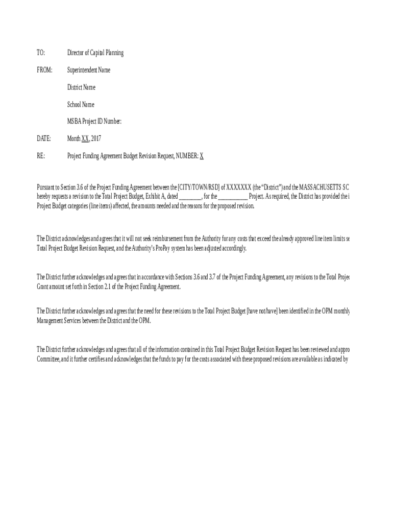 TO:Director of Capital PlanningFROM:Superintendent Name District Name School Name SBA Project ID Number:DATE:Month XX, 2017RE:Project Funding Agreement Budget Revision Request, NUMBER: Pursuant to