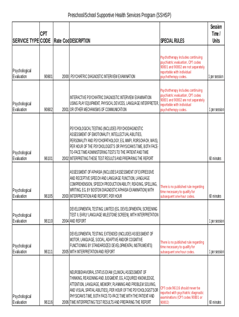 SERVICE TYPE CODE Rate CodDESCRIPTIONSPECIAL RULESPsychological