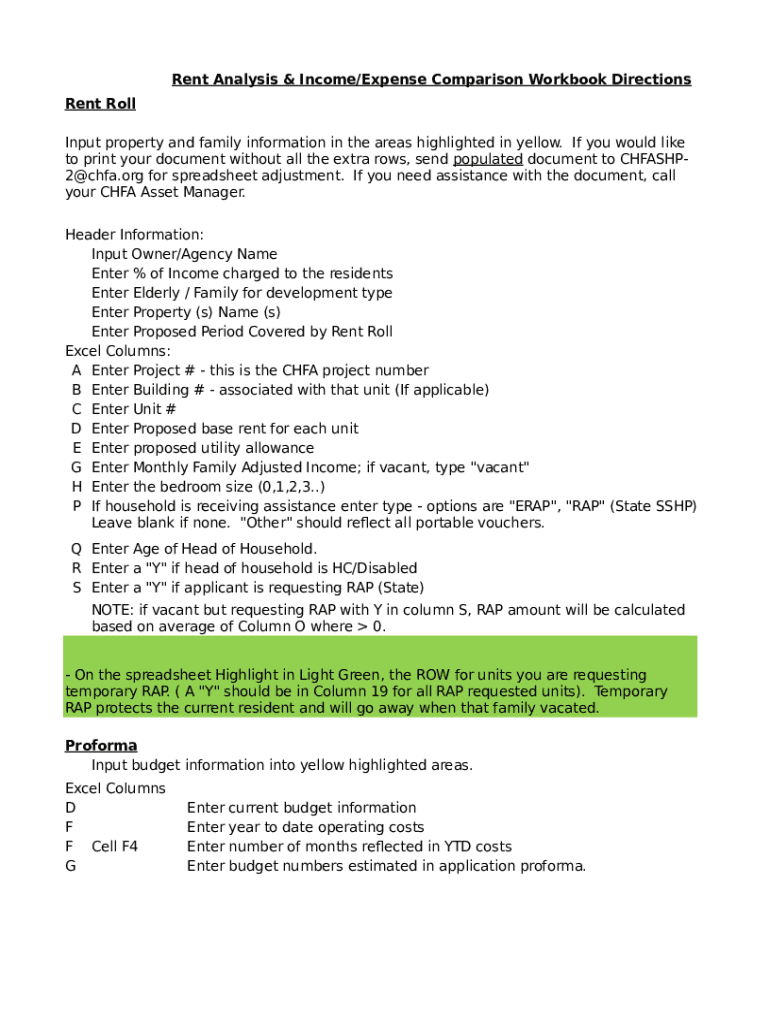 Rent Analysis & Income/Expense Comparison Workbook Directions Rent Roll Input property and family information in the areas highlighted in yellow. If you would like to print your document without all
