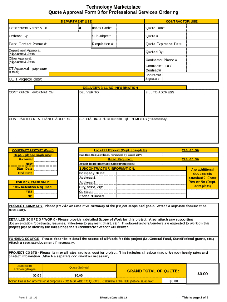 Technology Marketplace Quote Approval Form 3 for Professional Services Ordering DEPARTMENT Name & #:#CONTRACTOR Index Code:Quote Date:Ordered By:Subobject:Quote #:Dept. Contact Phone #:Requisition