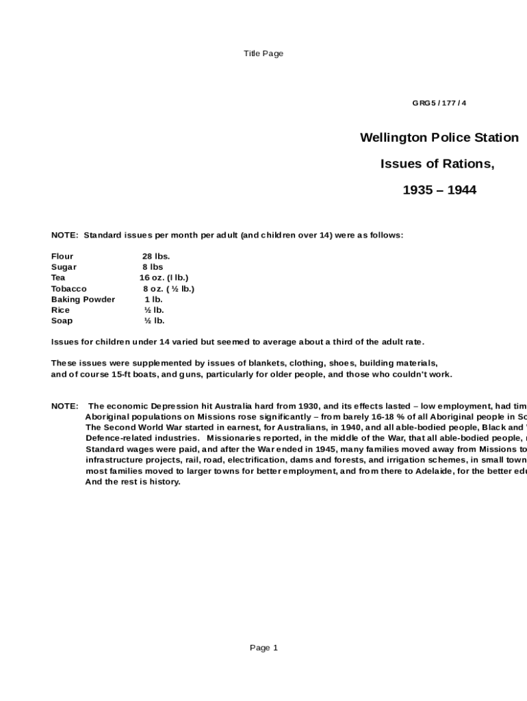 Title PageGRG5 / 177 / 4Wellington Police Station Issues of Rations, 1935 1944NOTE: Standard issues per month per adult (and children over 14) were as follows: Flour Sugar Tea Tobacco Baking Powder
