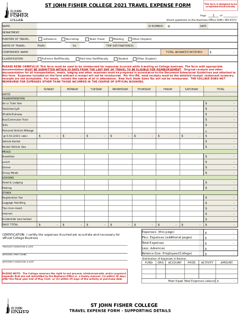 ST JOHN FISHER COLLEGE 2021 TRAVEL EXPENSE Forms form is designed to be