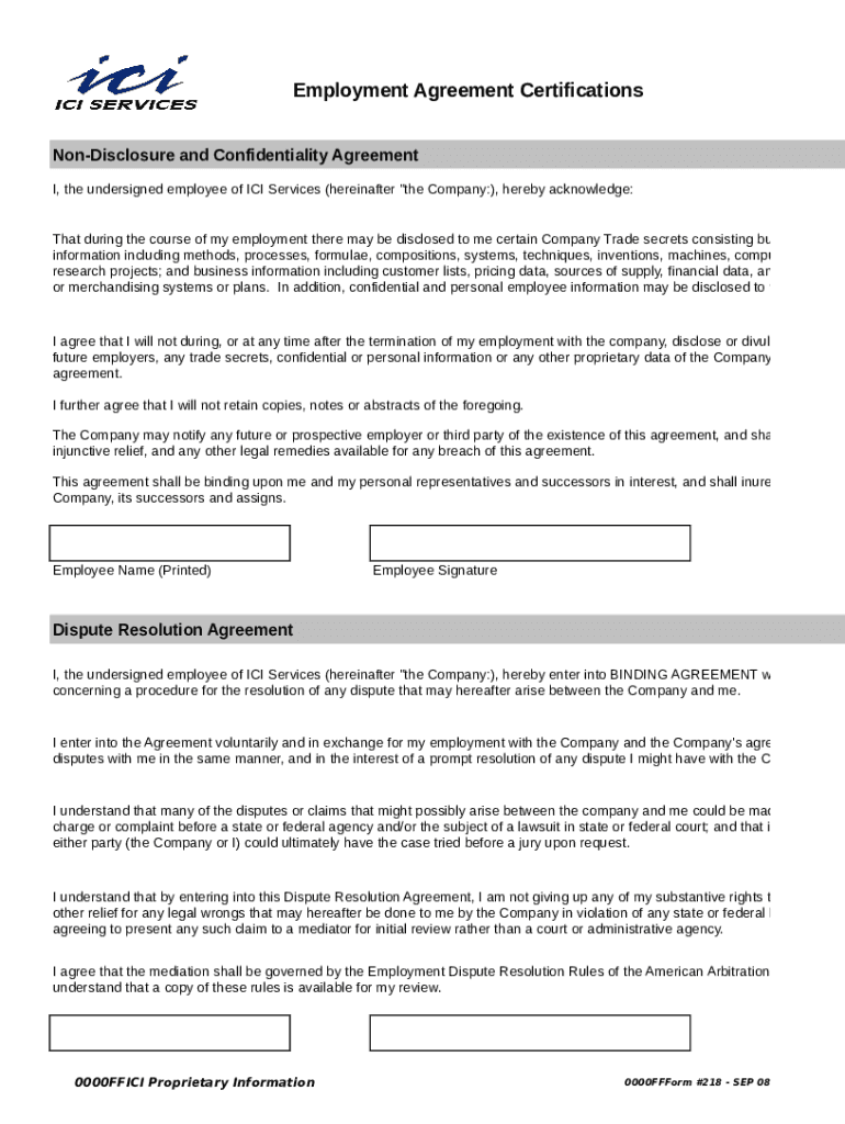 Employment Agreement Certifications Nondisclosure and Confidentiality Agreement I, the undersigned employee of ICI Services (hereinafter “the Company:), hereby acknowledge:That during the course