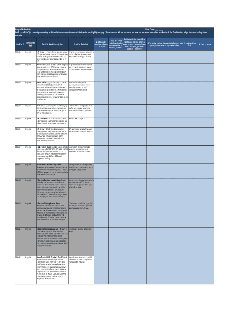 Army wide Controls Fund Center NOTE: ASA(FMC) is currently conducting additional discovery over the controls below that are highlighted gray. These controls will not be tested for now, but we would